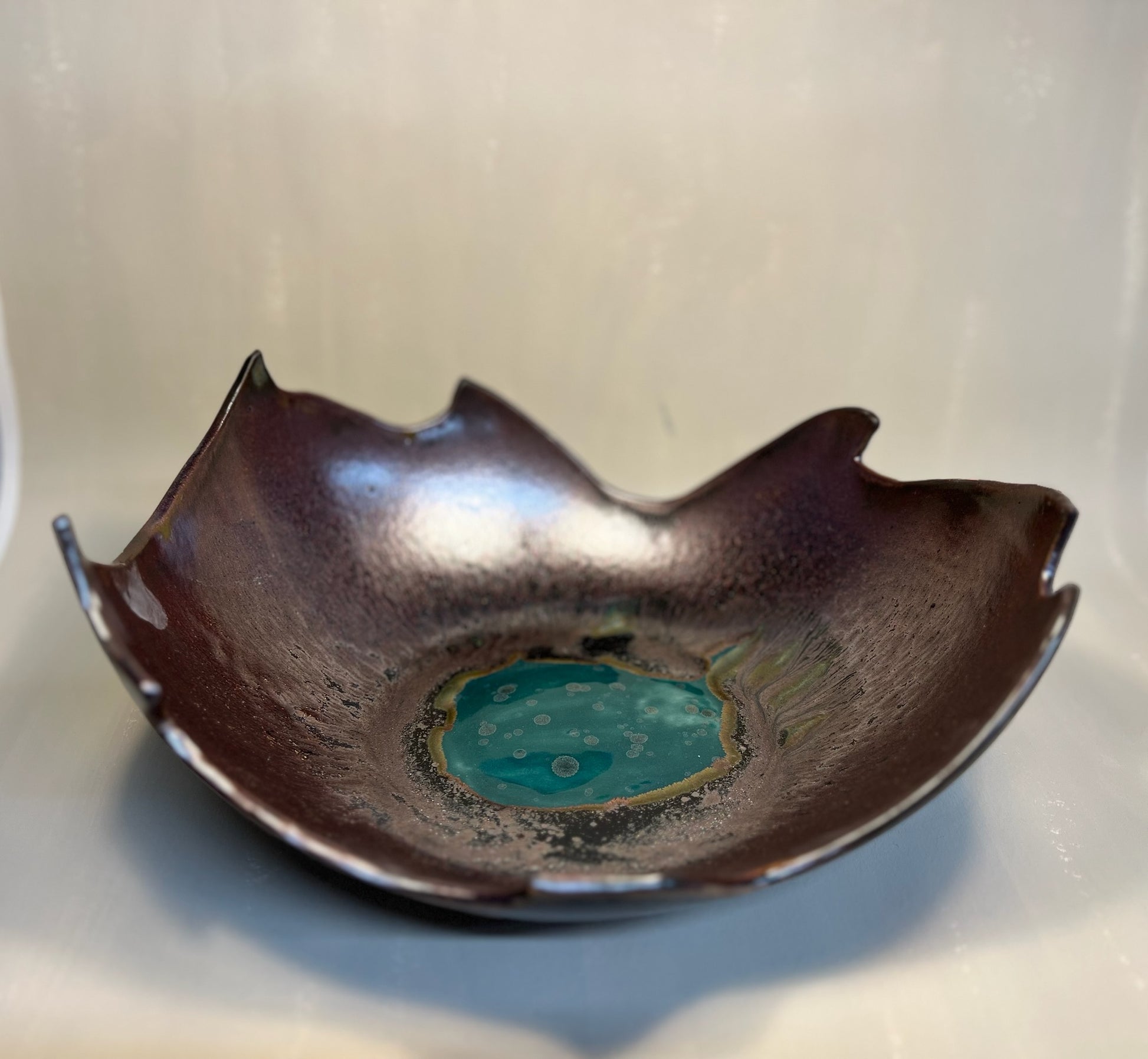 A sculptural ceramic bowl handcrafted in our studio. Its antique copper and bronze glaze is perfectly complimented by the iridescent pool of tranquil turquoise in the centre.